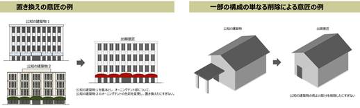 基本的には物品における創作非容易性の考え方と同様ですが、建築物の判断においてのみ「軽微な改変」の例として挙げられているものとして、「屋根の傾斜角の単純な変更」があります。