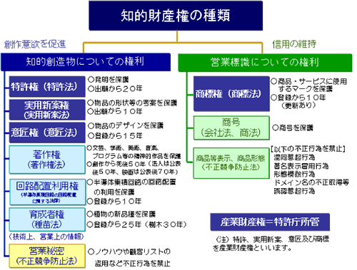 知的財産権とは、下記の図に示すように、特許権、実用新案権、意匠権、商標権からなる産業財産権に、著作権等を加えた権利の総称をいいます。また、知的財産は、土地・建物・宝石等とは異なり形がありません。そのため、知的財産権は「無体財産権」ともいわれます。
